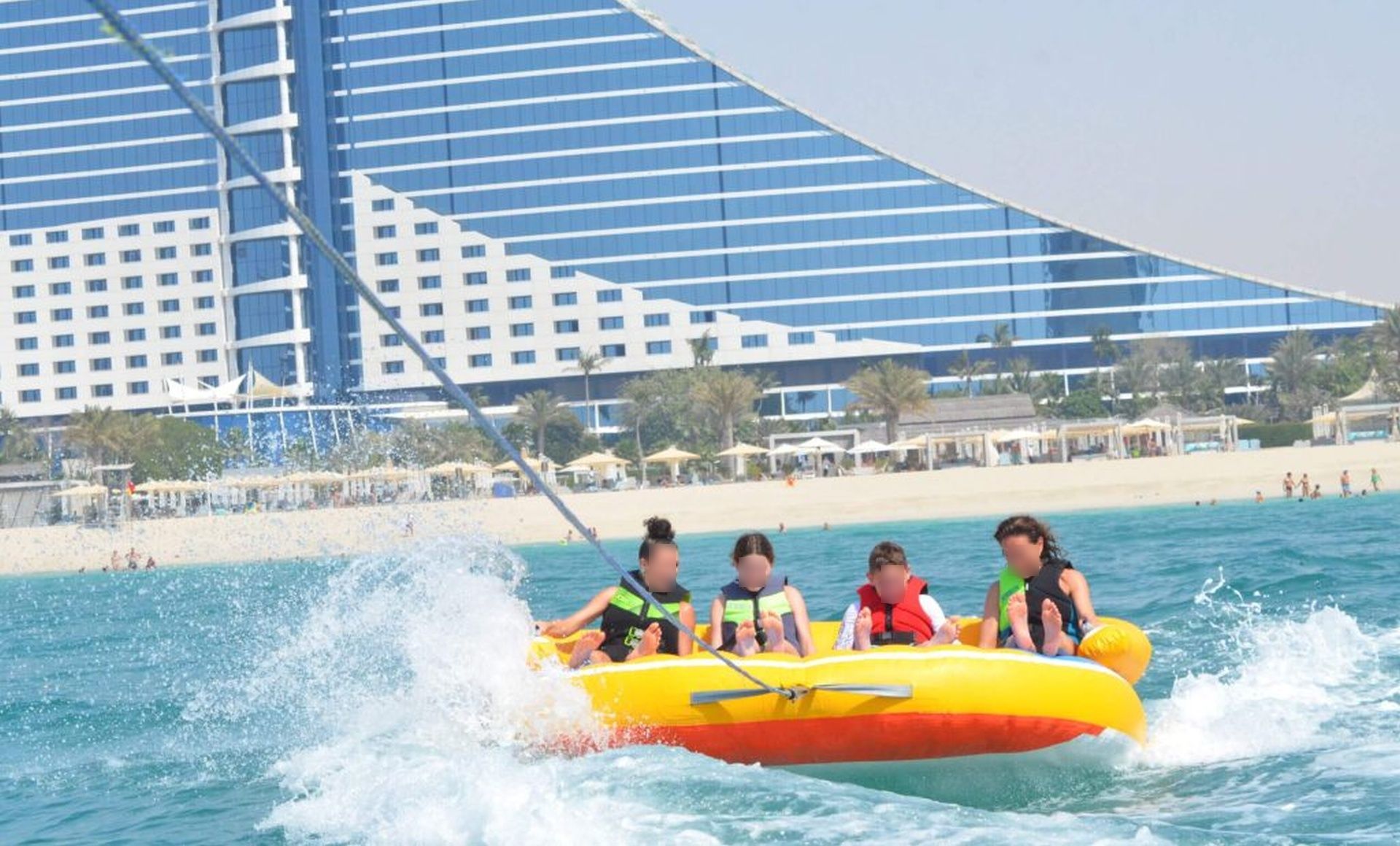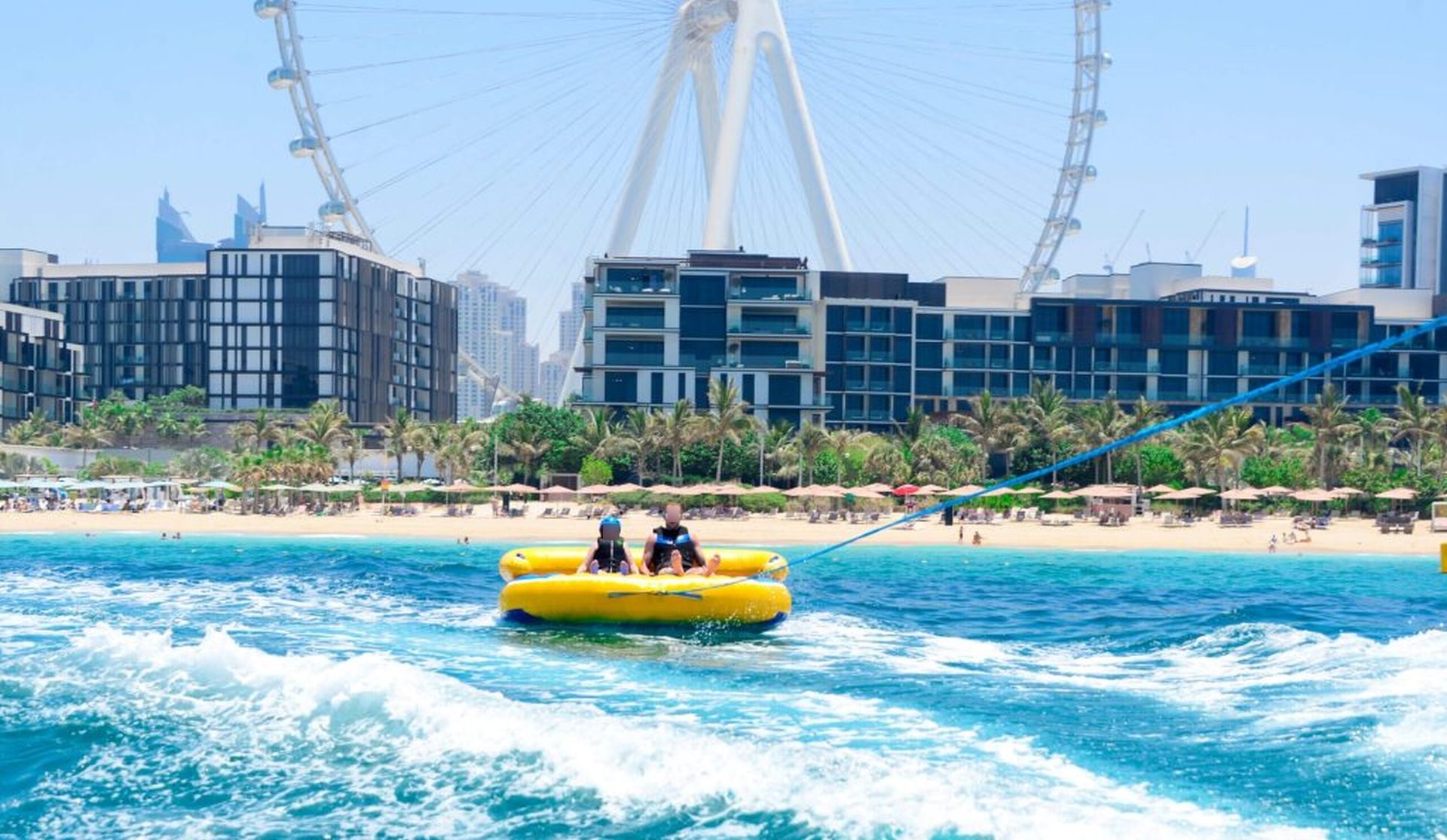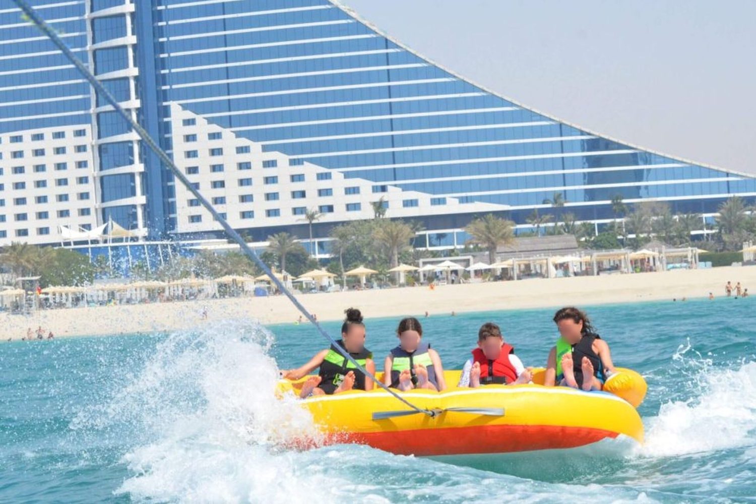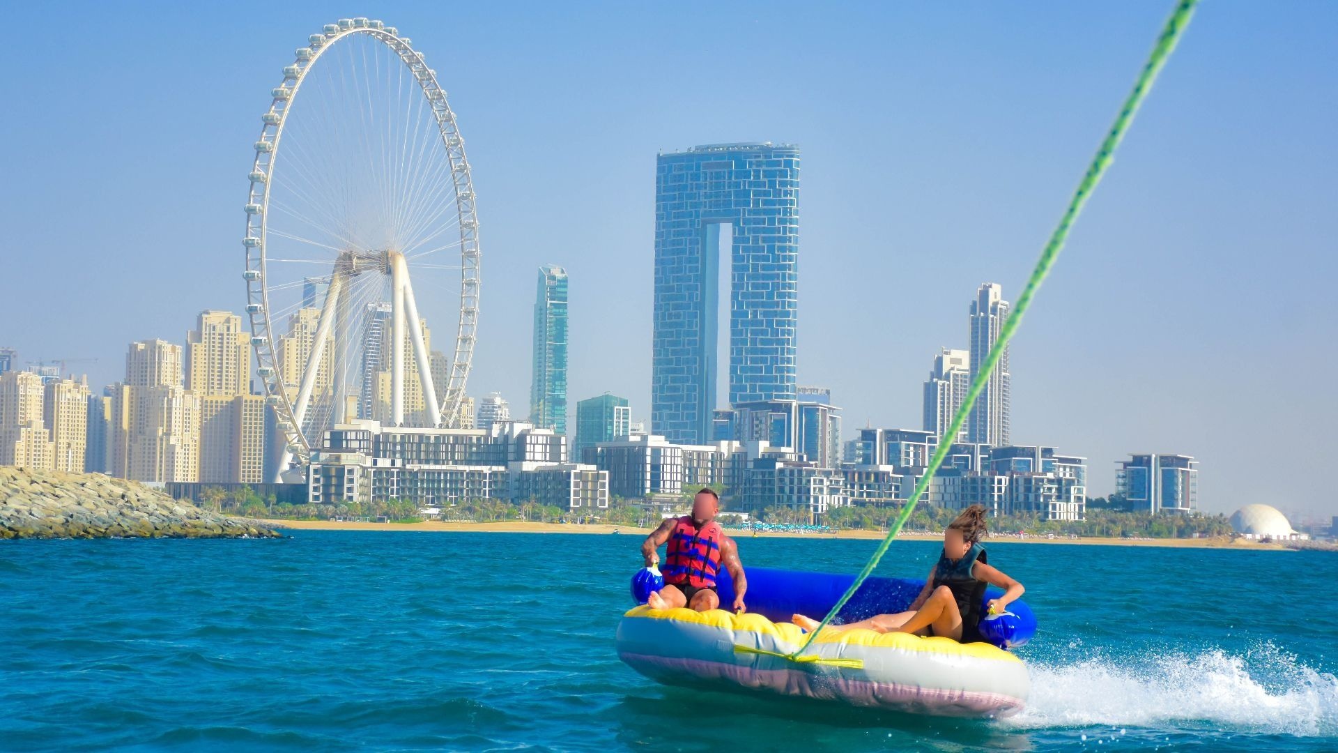 Get ready for the ultimate splash! Hold on tight as you zoom across Dubai’s crystal waters on our high-speed inflatable donut. It’s the perfect mix of adrenaline, laughter, and incredible city views.